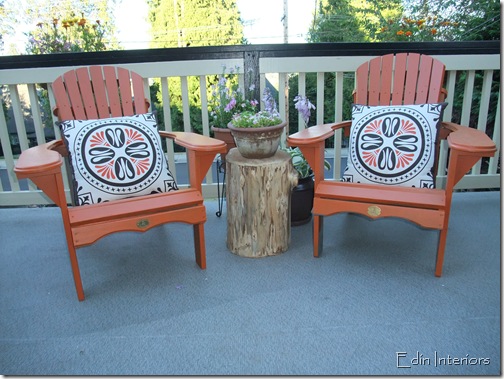 Perhaps you’ll remember the scenario… I purchased some fantabulous outdoor pillows for the furniture on my front deck. I re-stained my table and chairs to a rich warm brown so that they would coordinate perfectly with 2 of the pillows… but my 2 ugly Adirondack (or Muskoka – which ever name you prefer!) chairs just didn’t fit into the design plan. Come to think of it, I don’t know if they EVER fit in!!